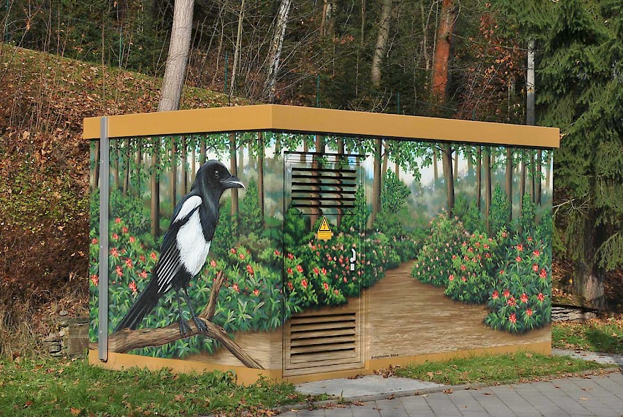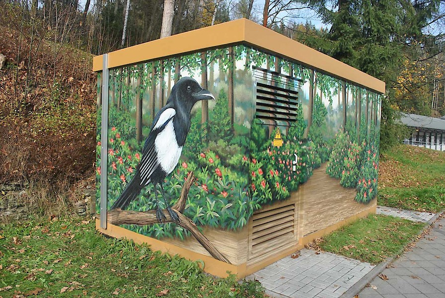 Das gefiederte Wahrzeichen Bad Elsters begrüßt die Gäste, sie ist im Auftrag der enviaM entstanden.