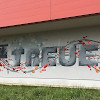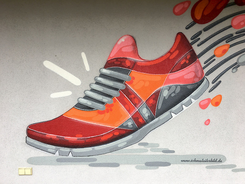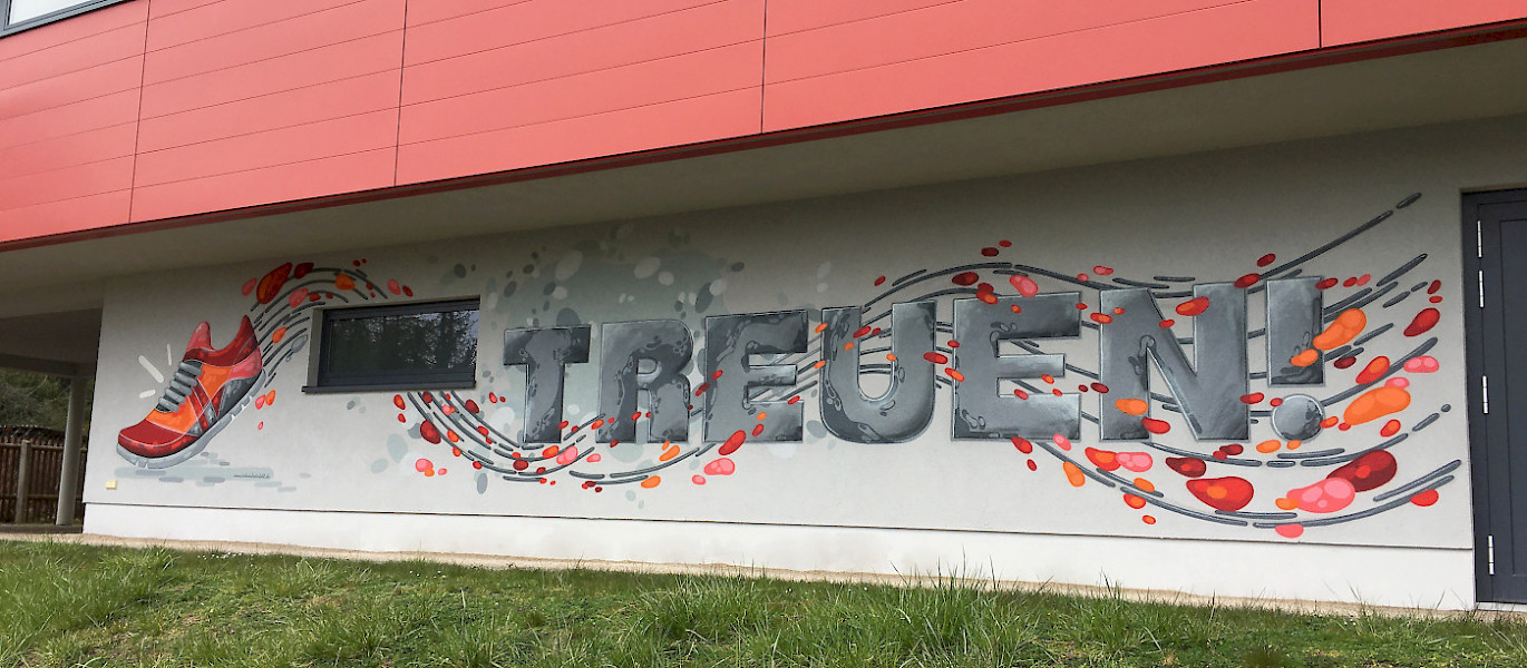 Gestaltung einer Turnhallenfassade mit sportivem Motiv.