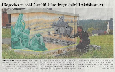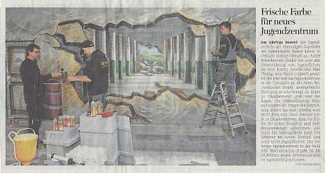 wurde zusammen mit vielen interessierten Jugendlichen in 2016 die Mauer an der Hempelschen Fabrik und 2017 der Garagenkomplex Seehaus in Farbe getaucht.
