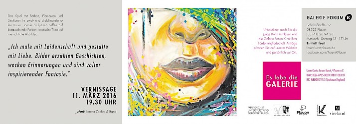 Meine aktuelle Austellung in der Galerie Forum K zeigt das Spiel mit Farben, Elementen und Strukturen im zwei- und dreidimensionalen Raum. Tonale Skulpturen treffen auf berauschende Farben, exotische Tiere auf menschliche Abbilder. Schauen Sie gerne zur Vernissage am 11.03.2016, ab 19:30 Uhr vorbei oder nutzen Sie die 3-wöchige Ausstellungszeit für einen Besuch.