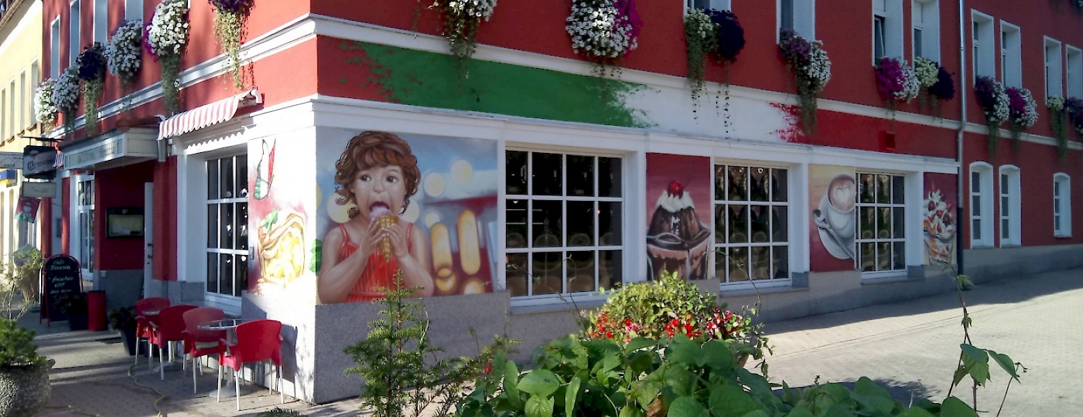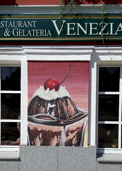 Fassadengestaltung mit kühlen und heißen Köstlichkeiten des Eiscafés Venezia.