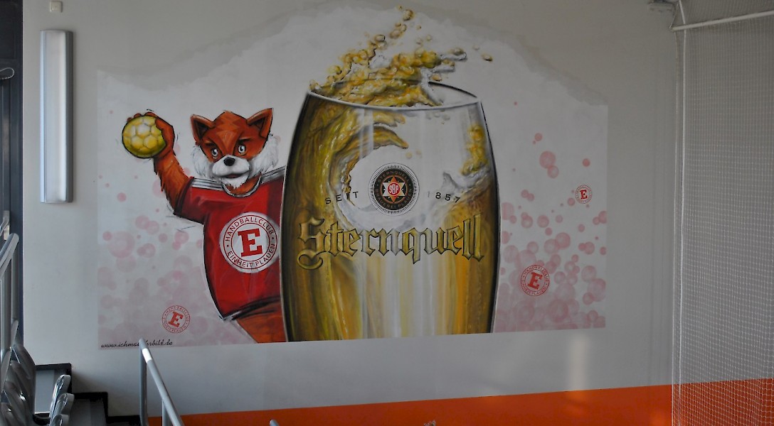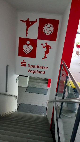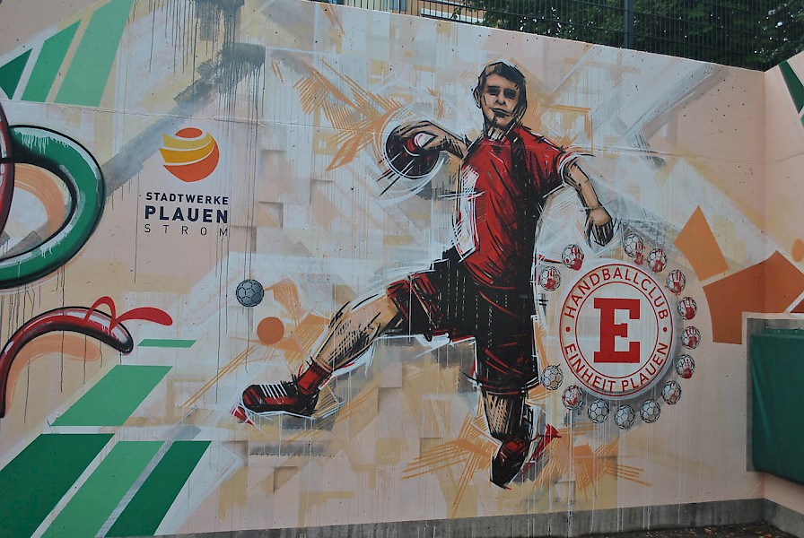 Handball in der Einheit Arena: dynamisch und energiegeladen. Die Außenanlage präsentiert sich von der sportlichen Seite, während der Innenbereich mit regionaler Note punktet.