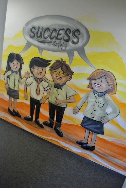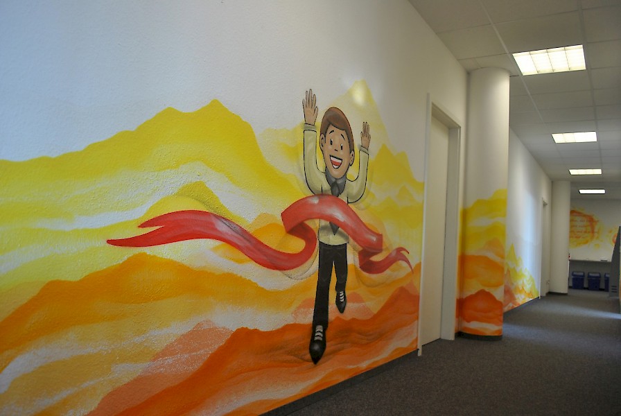 Gestaltung eines Seminarzentrums mit Schriftzug und Motiven, die die Kernbotschaft des Angebotes transportieren.