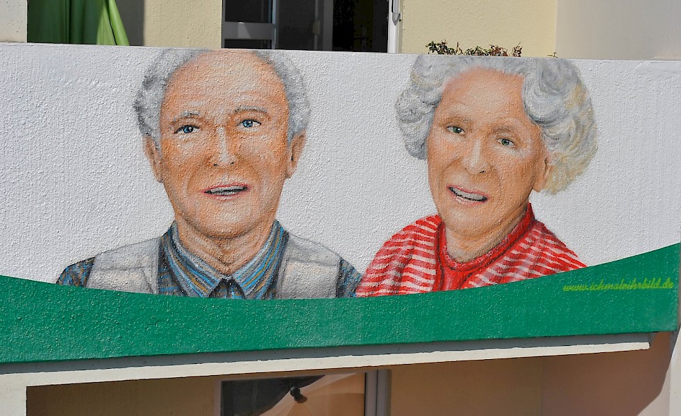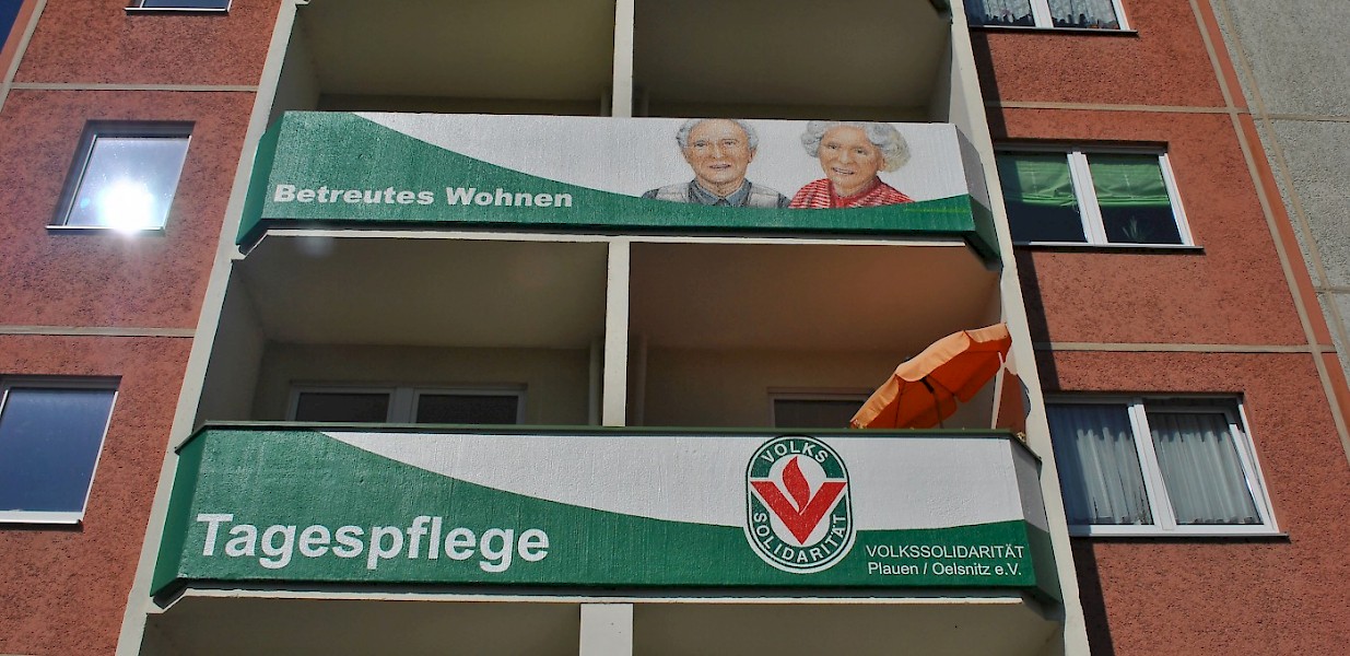 Balkongestaltung für die Volkssolidarität mit Darstellung des Portfolios und einem Werbemotiv als Eyecatcher.