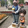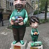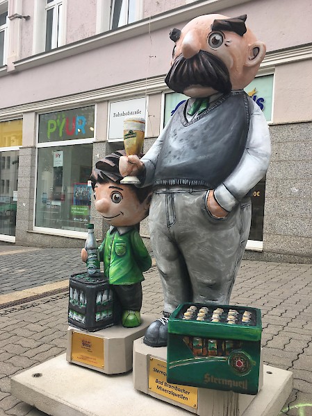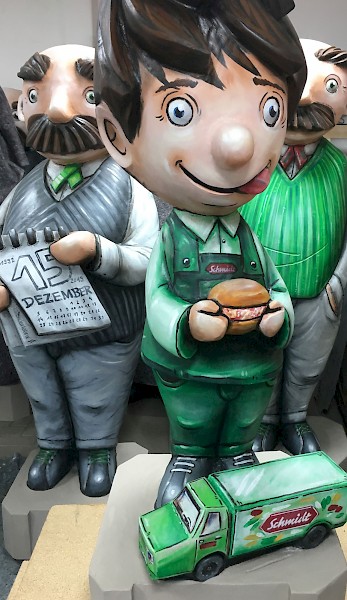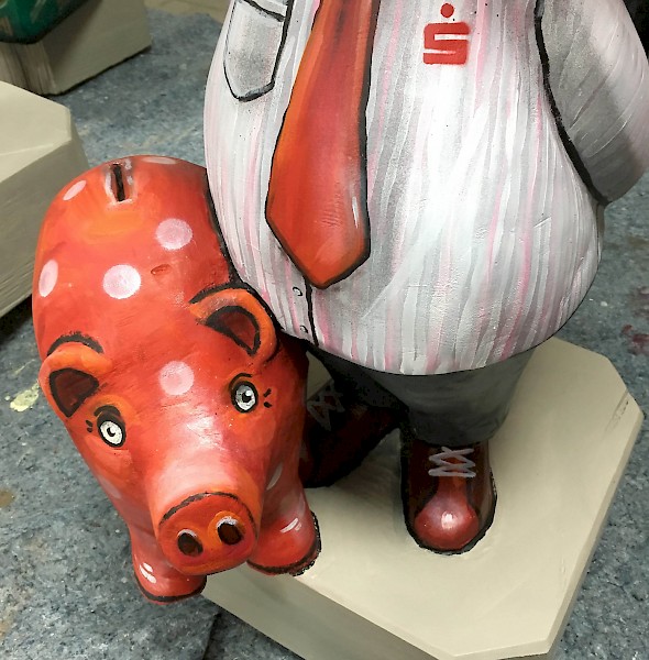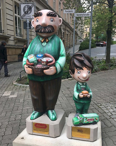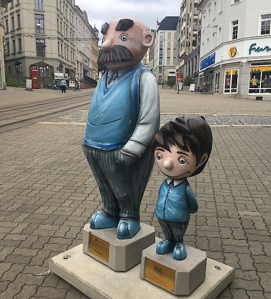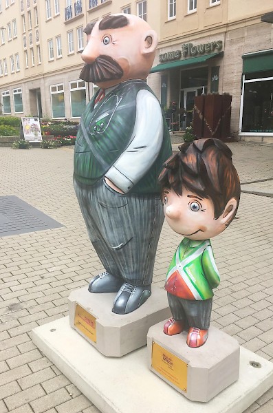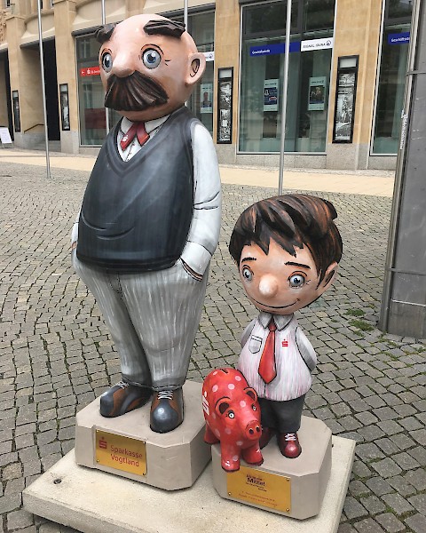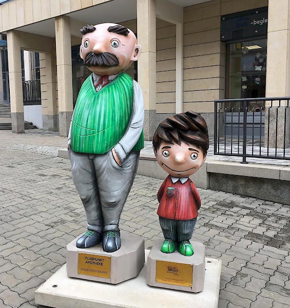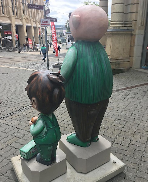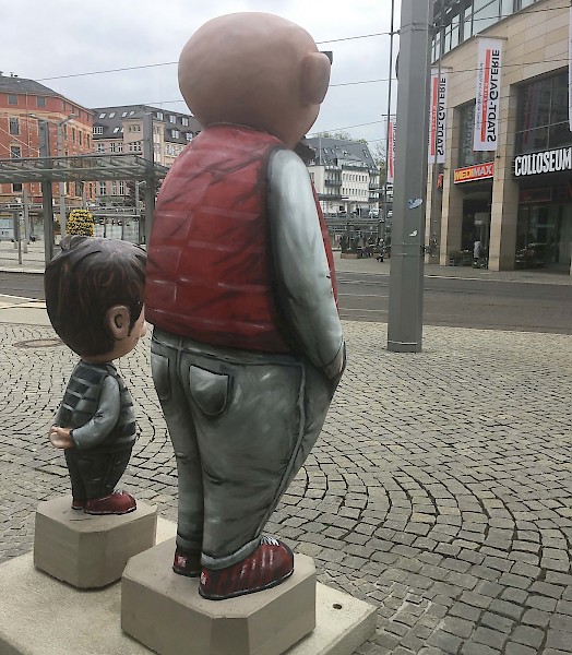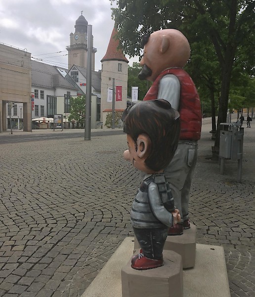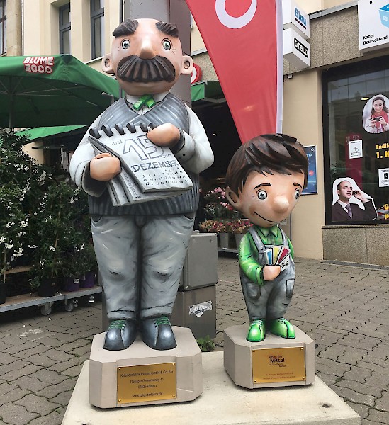 Bemalung von 10 Vater und Sohn Skulpturen nach Wünschen der Auftraggeber in 3D-Optik, zu sehen sind diese entlang der Plauener Bahnhofstraße.